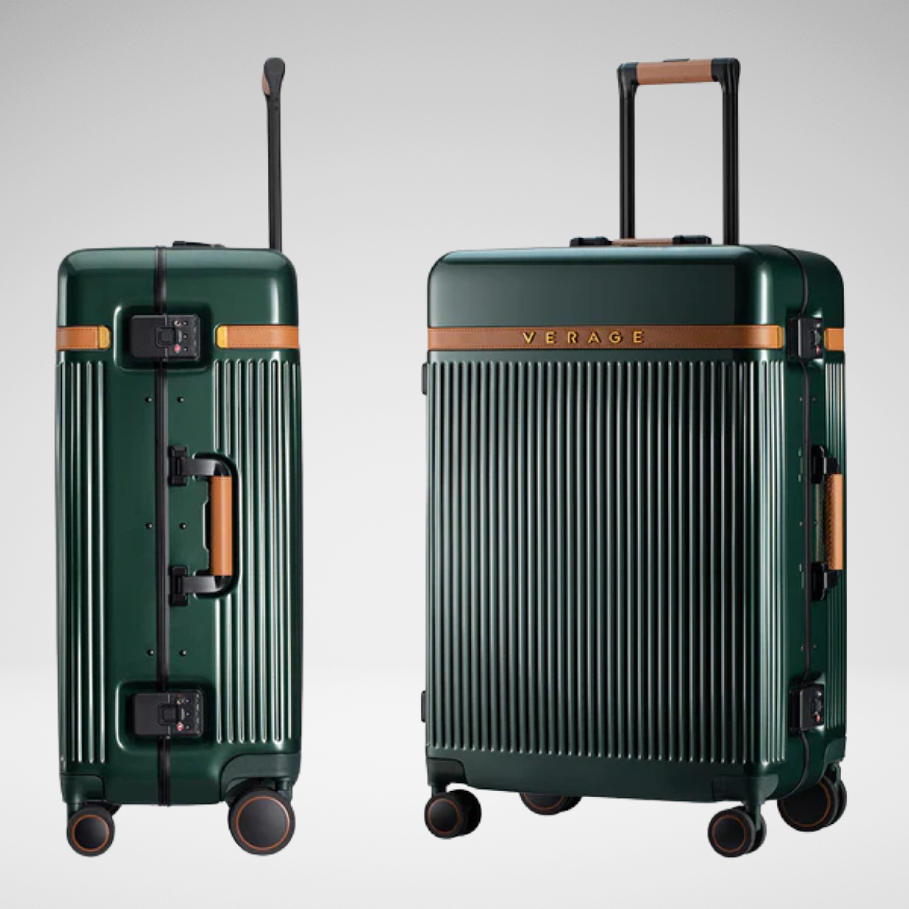 LUXURY WITH FUNCTIONALITY: Unites the resilience of aluminum-magnesium alloy with the supremely lightweight quality of polycarbonate, creating the perfect balance between Lightweight and long-lasting PERFORMANCE AND STYLE: The ONLY hard side luggage with All-terrain spinner wheels with combination of larger rear-3 inch and front-2.2 inch, which allows it to run well in any road conditions. Features an ergonomic grip with hand-made PU leather handle
